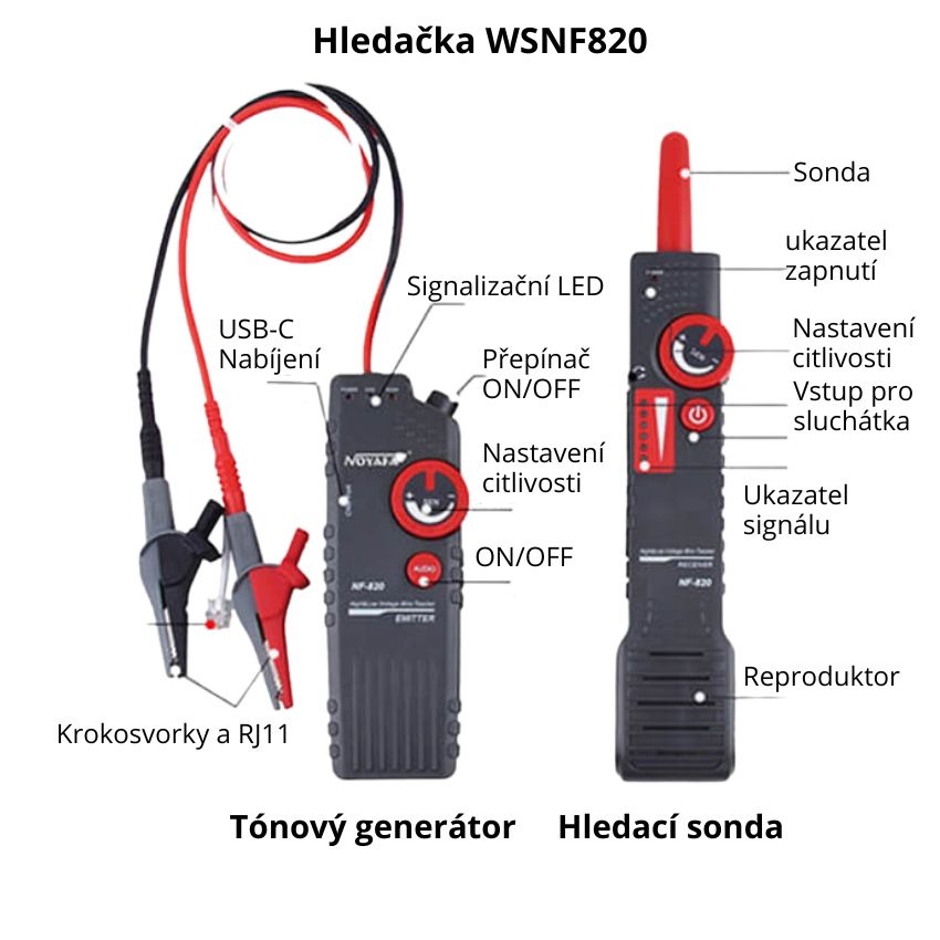 Hledačka kabelů WSNF820, délka 1000m, vzdálenost 0-2 m, 0-400V, nastavení citlivosti, AC filtr, trasování 1 a více žil. kabelů.