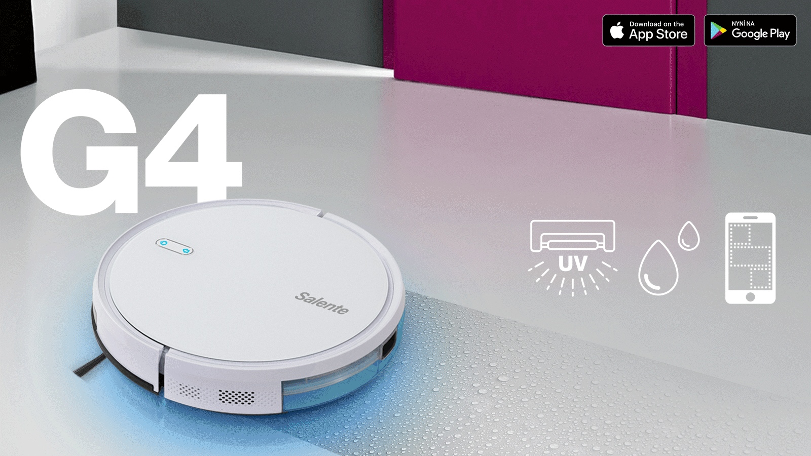 Salente G4 je schopen vaši podlahu vysávat, vytírat a desinfikovat pomocí vestavěné UVC lampy současně. Pomocí SMART gyroskopické navigace a snadné kontroly uklízeného prostoru pomocí mobilní aplikace v českém jazyce dokáže snadno, rychle a kvalitně uklidit váš členitý byt nebo dům a po ukončení úklidu se vrátit zpět do nabíjecí základny.