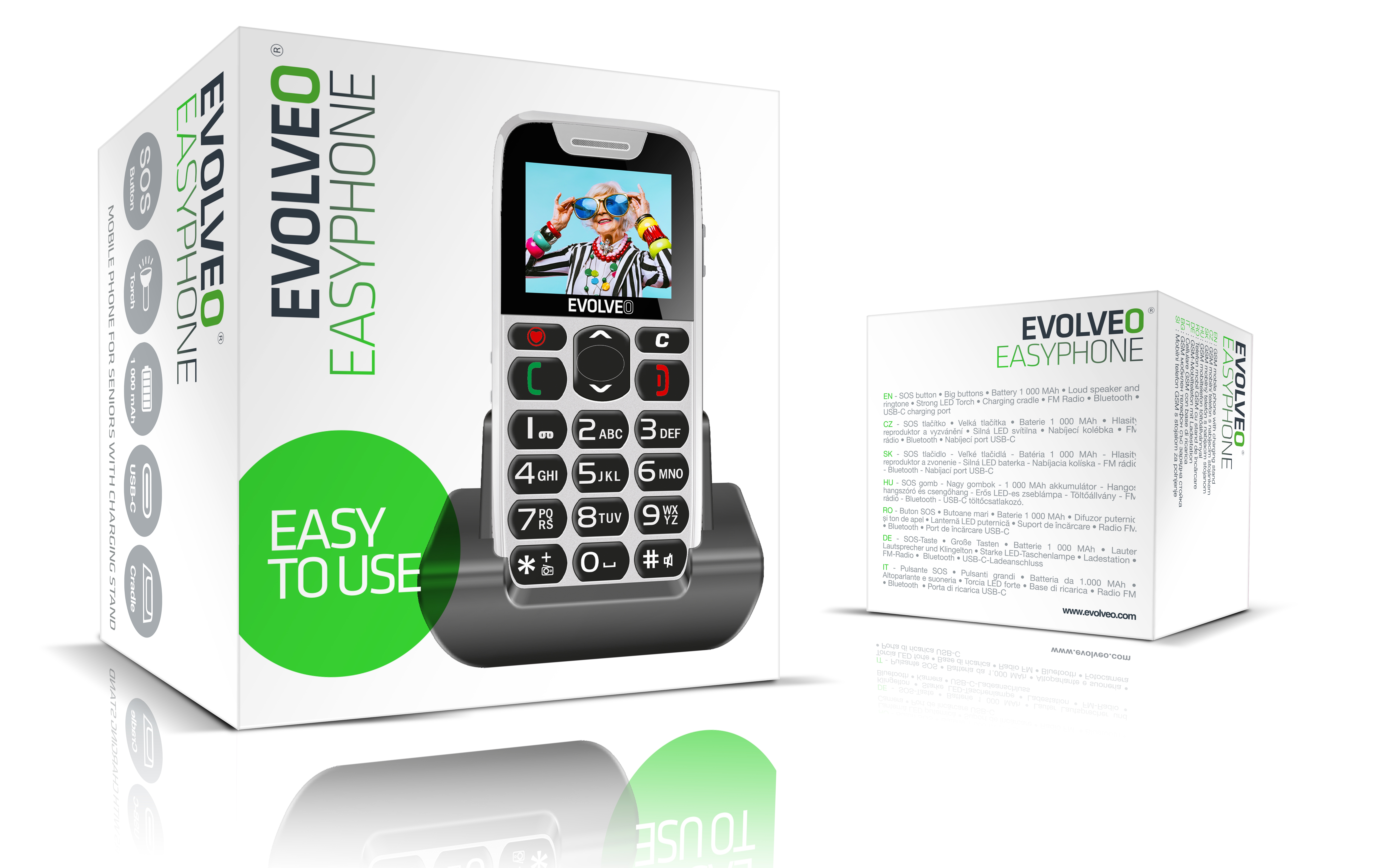 Telefon je dodáván s praktickým nabíjecím stojánkem, který zjednodušuje nabíjení baterie. Stačí telefon zasunout do stojánku a nabíjení se spustí automaticky, což ušetří čas a usnadní každodenní používání telefonu. Kapacita 1000 mAh Li-Ion baterie a výdrž až 8 dní zajistí, že telefon EVOLVEO EasyPhone nezradí, když ho nejvíce potřebujete.