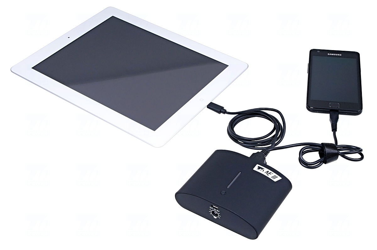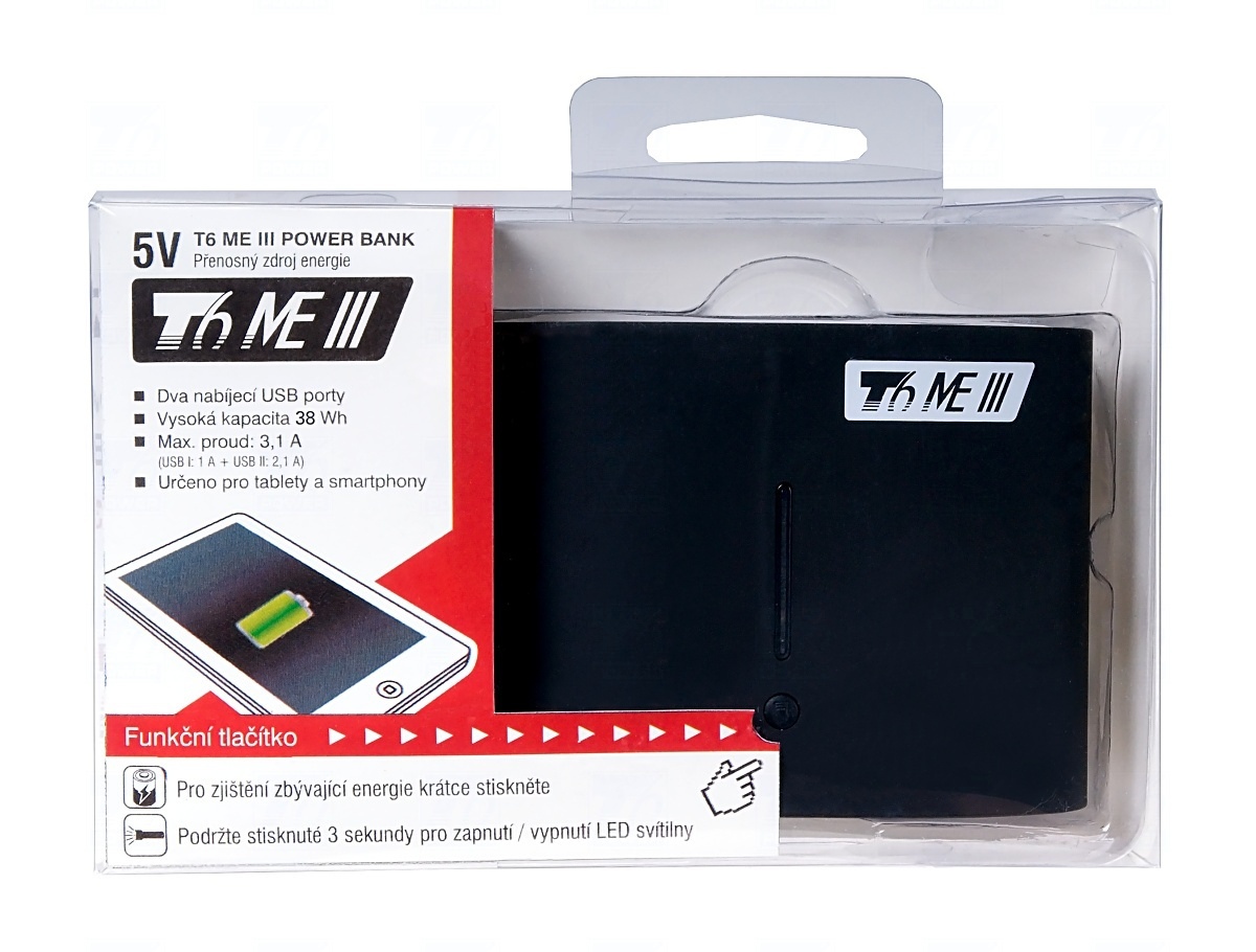 Externí baterie T6 power ME III je ideální externí zdroj energie pro mobilní zařízení. Externí baterie T6 power ME III umožňuje nabíjet všechny tablety a další zařízení napájená pomocí USB kabelu s libovolným konektorem. Můžete tak použít vlastní napájecí USB kabel z příslušenství Vašeho mobilního zařízení. Prostřednictvím dvou USB portům můžete nabíjet dvě mobilní zařízení zároveň. Jeden z USB portů je přitom schopen díky výstupu 2,1 A nabíjet i ta nejnáročnější mobilní zařízení, jako jsou například zmíněné tablety.