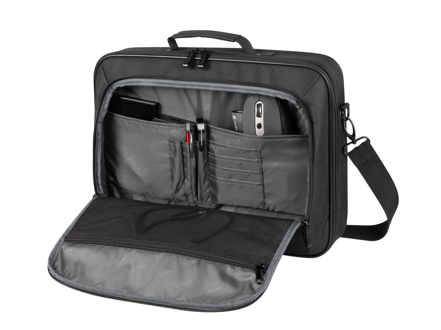 Pokud používáte další příslušenství, Natec Boxer Lite 15,6" vám ho umožní vzít s sebou. Do kapes umístěných v přední přihrádce se snadno vejde oblíbená myš, multiport, přenosný pevný disk nebo powerbanka. Propisky a vizitky můžete uložit do speciálního organizéru. Uvnitř najdete také speciální kapsu na kabely a nabíječku. V brašně Natec Boxer Lite 15,6" má vše své místo.