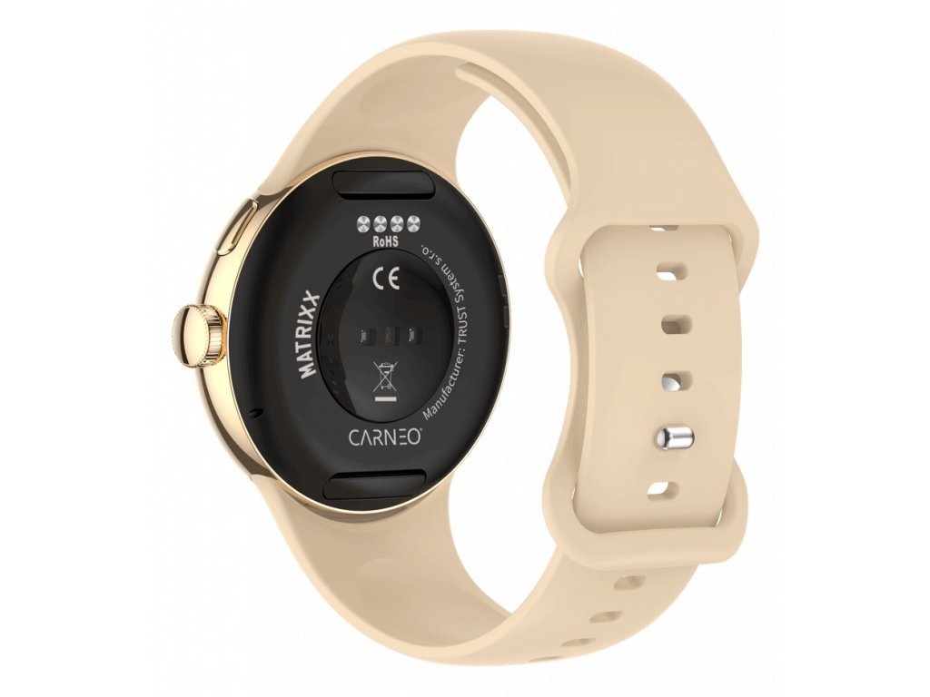 Moderní fitness smart hodinky Carneo Matrixx HR+ v elegantním zlatém provedení disponují kulatým Super HD AMOLED barevným displejem. Umožňují měření srdečního tepu, stresu, BMI, ujeté vzdálenosti, monitorování spálených kalorií či kvality spánku. Jejich součástí je 260mAh baterie s výdrží 3 až 5 dní. Tyto inovativní smart hodinky s certifikací IP68 Vám nabízejí svobodu a bezstarostnost ve všech životních situacích, včetně plavání a dalších vodních aktivit. Jsou kompatibilní s operačním systémem iOS a Android. Hodinky mají na dotek příjemný silikonový řemínek v černé barvě, který lze vyměnit za řemínek v jiné barvě a tím pádem přizpůsobit jejich vzhled vašemu outfitu. Vkusný, jednoduchý a luxusní design se snadno kombinuje k obleku či volnočasovému outfitu. Hodinky i aplikace jsou kompletně v češtině, takže si budete jistě spolu dobře rozumět.