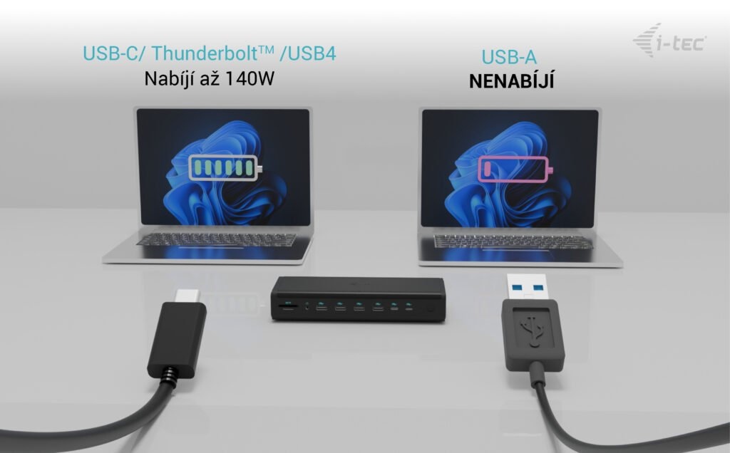 * V případě připojení přes USB-A budou podporovány pouze čtyři monitory přes porty DP a HDMI a nebude možné nabíjet notebook/tablet.