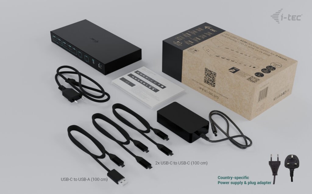 Tato vysoce výkonná dokovací stanice umožňuje současné připojení až tří hostitelských zařízení – jednoho PC nebo herní konzole a dvou notebooků či tabletů. Je plně kompatibilní se zařízeními s porty USB-C, USB4 nebo Thunderbolt 3/4/5. Počítače nebo konzole lze připojit přes HDMI a USB.
