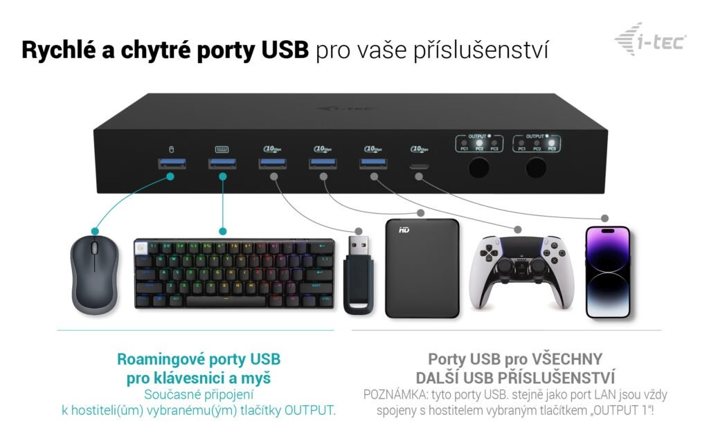 • Podpora až 3 hostitelských zařízení (2× notebook/tablet + 1× herní konzole/PC)