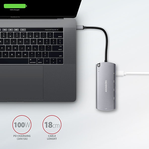 Elegantní hliníkové tělo zajistí nejen mechanickou odolnost, ale i kvalitní chlazení. Potěší také jemně strukturovaný povrch, na kterém nezůstávají otisky prstů. Replikátor portů je ideálním doplňkem pro notebooky bez USB-A konektorů, síťové karty a video výstupu. Napevno uchycený USB-C kabel délky 18 cm.