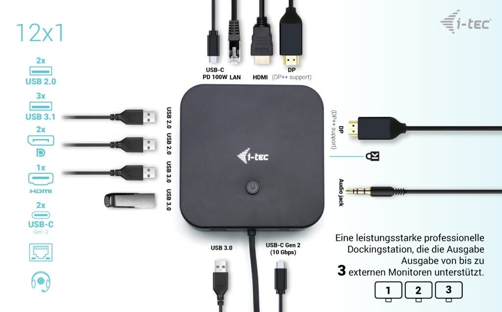 Vysoce výkonná kancelářská dokovací stanice USB-C, která podporuje až 3x externí monitor v rozlišení 4K. Stanice je kompatibilní s jakýmkoliv notebookem vybaveným portem USB-C, USB4 nebo Thunderbolt 3/4. 6x USB port, spolehlivé a rychlé připojení do podnikové sítě díky integrovanému LAN portu a podpora instalace za monitor, to vše z této dokovací stanice dělá ideálního společníka pro profesionály. Samozřejmostí je podpora nabíjení vašeho notebooku či tabletu, a to až 100 W.
