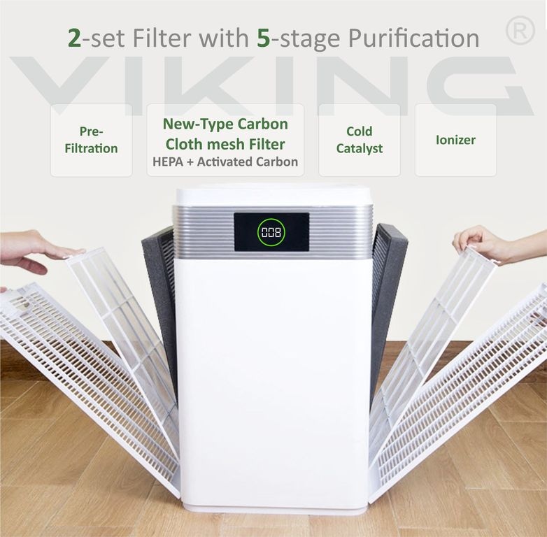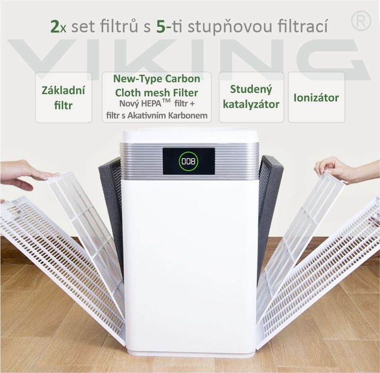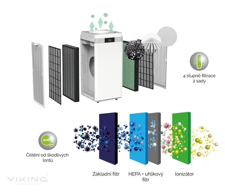 • 2x 4 stupňová filtrace včetně ™?HEPA filtrace a filtrační vrstvy studeného katalyzátoru, který účinně rozkládá organické sloučeniny a toxické látky, stejně jako UV lampa.