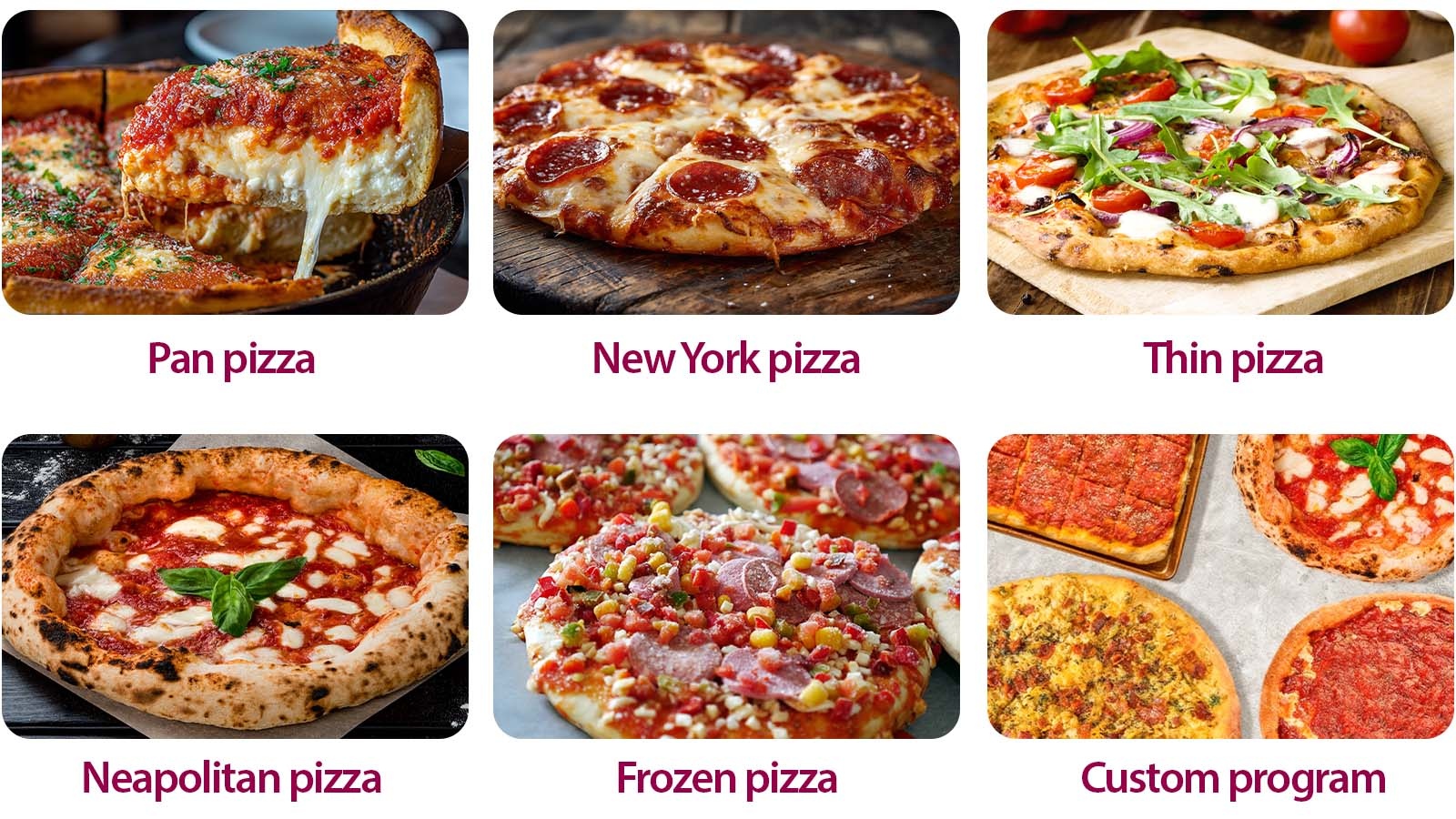 • Neapolitan pizza: tradiční neapolský styl s výrazným, vzdušným okrajem a jemným středem. Tento program využívá extrémně vysokou teplotu a krátkou dobu pečení, aby těsto zůstalo lehké a získalo typické lehce spálené puchýřky po okrajích