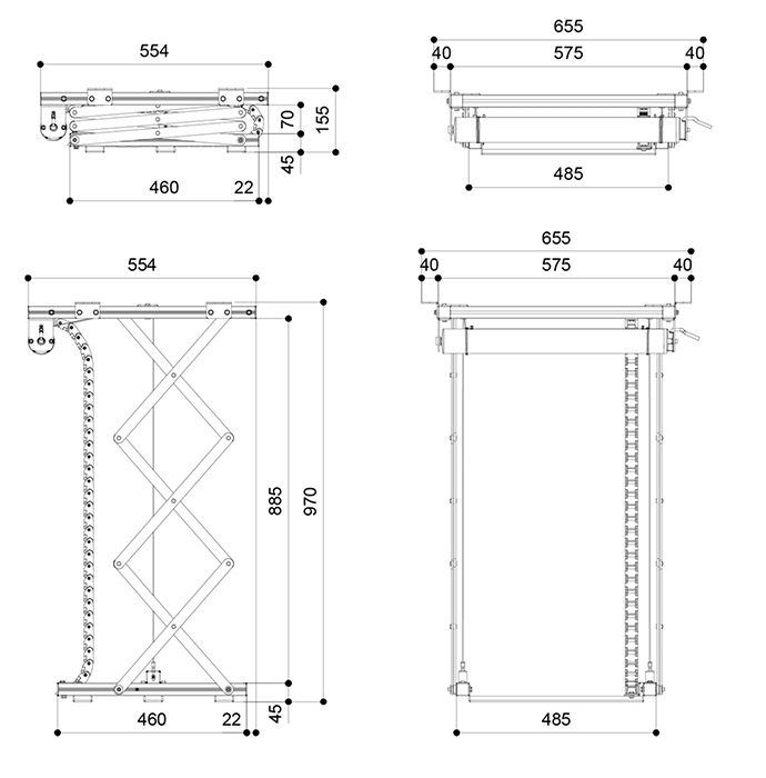 Rozměry uzavřeného výtahu 575 x 155 x 554 mm (š x v x h)