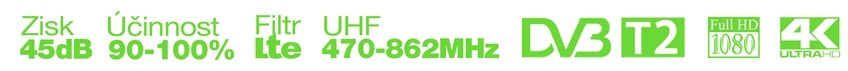 Vestavěný zesilovač s externím napájením a parametry předurčují anténu pro použití v oblastech se slabým TV signálem. Produkt je vybavený LTE filtrem, který odfiltruje signál mobilních operátorů a příjem TV signálu je tak zcela bez komplikací. Anténa zvládá příjem v širokém spektru 470-700MHz a umožní tak příjem všech TV kanálů. Účinnost přeměny TV signálu na elektrický signál je 90-100% v závislosti na frekvenci signálu. Anténa je připravena na příjem TV ve vysokém rozlišení obrazu 4K/UHD. Speciální aerodynamický tvar antény má lepší prevenci proti sněhu, čí proudění větru než antény klasických tvarů.