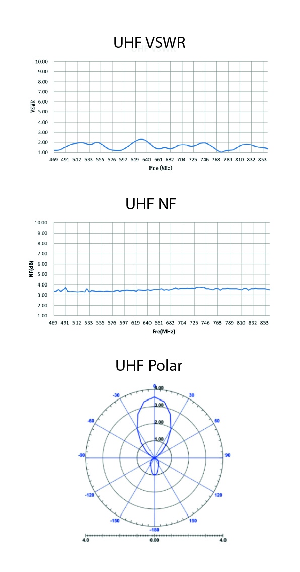 UHF VSWR (Voltage Standing Wave Ratio) graf vyjadřuje účinnost antény pro pásmu UHF. Koeficientem VSWR rovný 1 znamená přeměnu všech elektromagnetických vln na elektrický signál. Graf VSWR pro anténu HDO dosahuje velice vyrovnané účinnosti a prakticky pro žádné frekvenční pásmo nevykazuje nižší účinnost než 90%, tedy hodnota grafu VSWR není až na výjimky vyšší než 2.