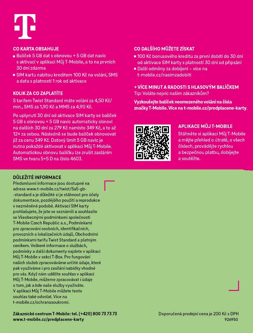 *Po uplynutí 30 dní od aktivace SIM karty se balíček 5GB s obnovou + 5GB navíc automaticky obnoví na dalších 30 dní s 20% slevou za 279Kč namísto 349 Kč, a to až dvanáctkrát za sebou. Následně se bude balíček obnovovat již za cenu 349 Kč. Datový limit 5 GB navíc je nutno pokaždé aktivovat v aplikaci Můj T-Mobile.