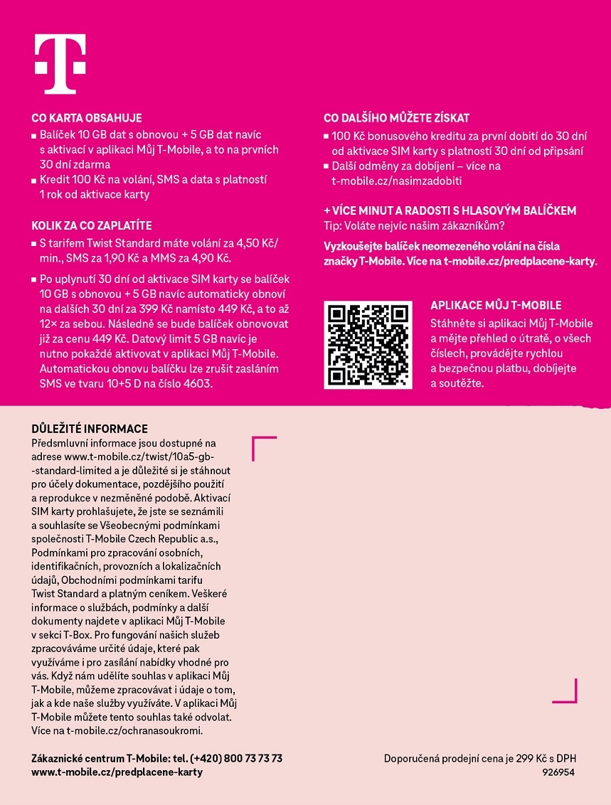 *Po uplynutí 30 dní od aktivace SIM karty se balíček 10GB s obnovou + 5GB navíc automaticky obnoví na dalších 30 dní s 10% slevou za 399Kč namísto 449 Kč, a to až dvanáctkrát za sebou. Následně se bude balíček obnovovat již za cenu 449 Kč. Datový limit 5 GB navíc je nutno pokaždé aktivovat v aplikaci Můj T-Mobile.