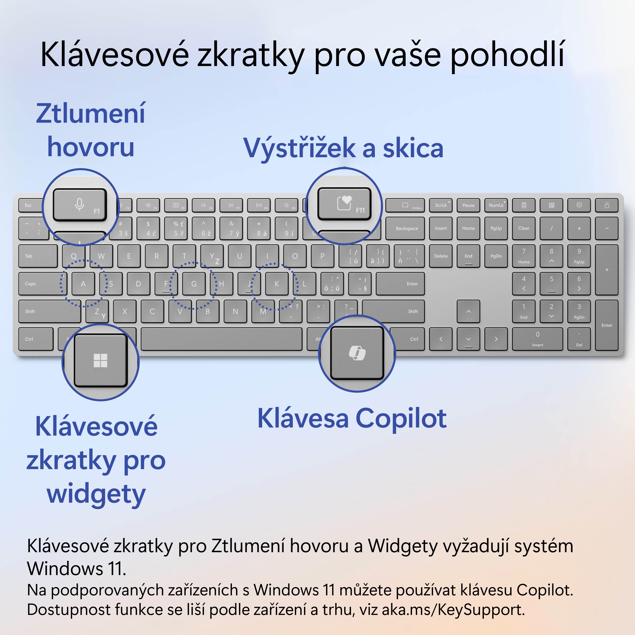 * klávesa Copilot pro Windows, Expresivní vstup, Výstřižky/Snímek obrazovky, Ztlumení hovoru a Widgety