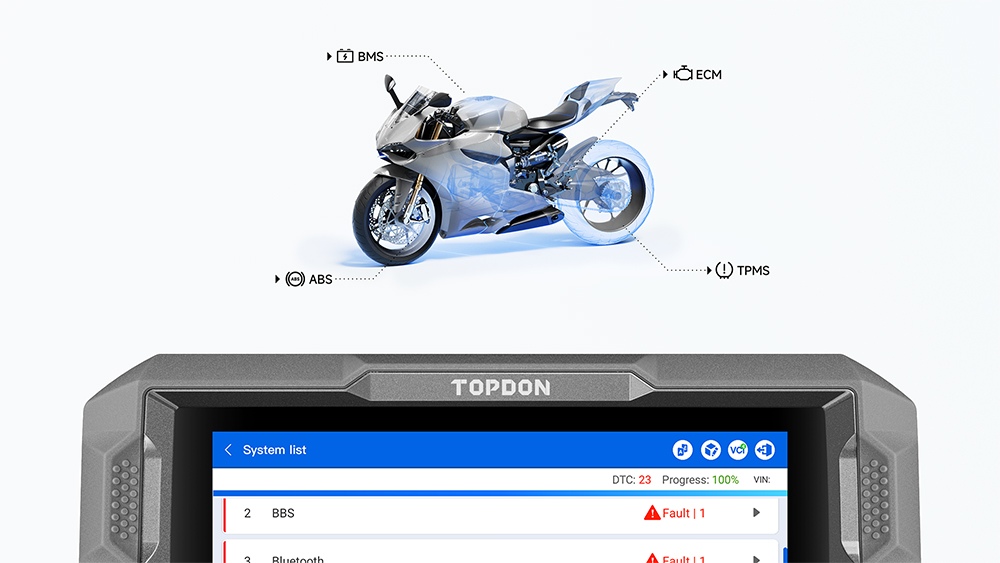 Navržen pro odborné techniky, TOPDON diagnostické zařízení UltraDiag Moto nabízí rychlou, přesnou a všestrannou diagnostiku. Pokrývá více než 80 značek motocyklů (Honda, Harley-Davidson, BMW a další) s kompletním systémovým skenováním, obousměrným ovládáním, resetováním údržby a adaptací komponentů. Jeho bezdrátové připojení zvyšuje efektivitu a pomáhá vám zefektivnit opravy a zvýšit produktivitu. Poskytujte přesnou diagnostiku a výjimečné služby s konzistentními výsledky.