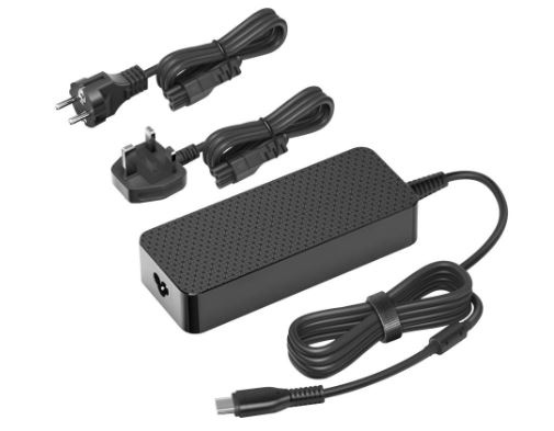 Součástí je připojený USB-C kabel a odnímatelný napájecí kabel pro zástrčky standardu EU nebo UK.