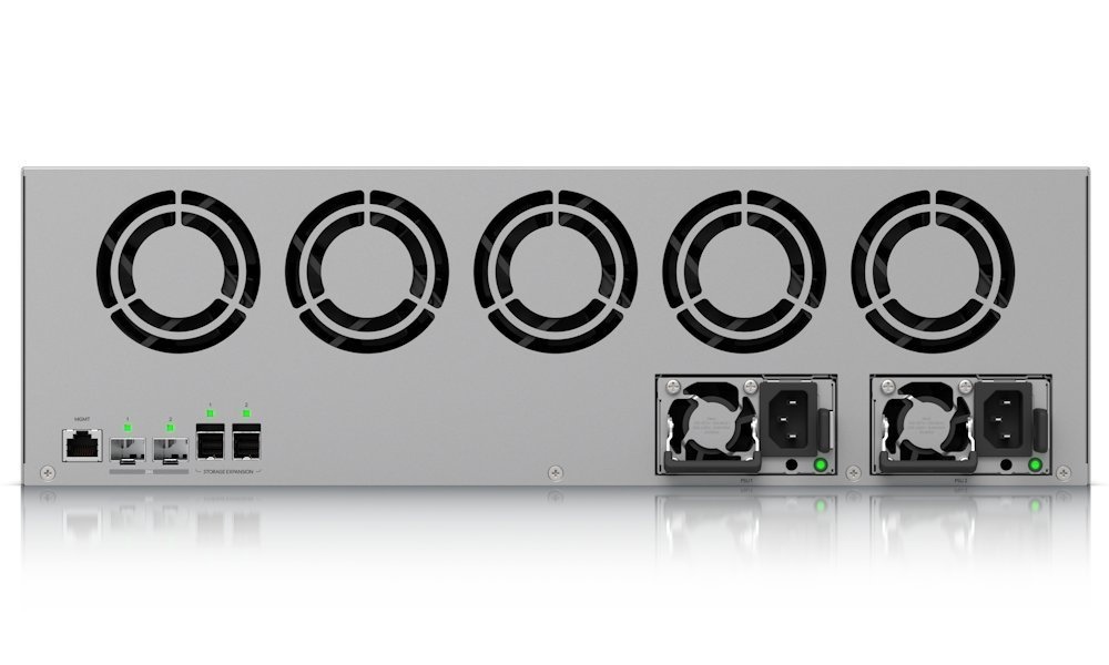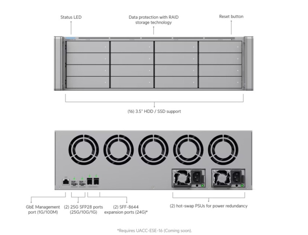 Dva SFF-8644 porty umožňují připojení rozšiřovacích jednotek UACC-ESE-16 pro navýšení kapacity až na 48 disků celkem.