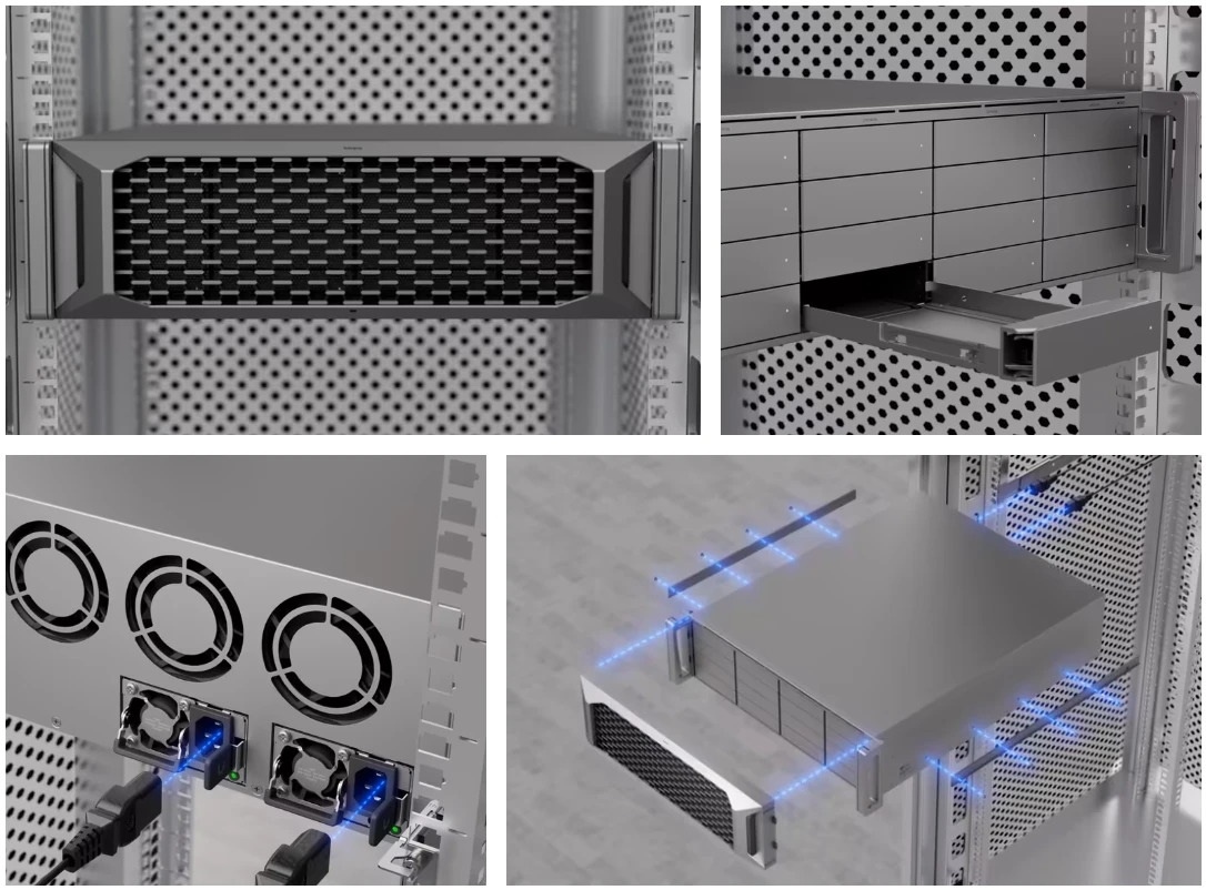 Systém nabízí dva 25G SFP28 porty s podporou agregace linek pro vysokorychlostní připojení k síti a redundanci. Redundantní hot-swap napájecí zdroje s výkonem 550 W garantují nepřetržitý provoz i při výpadku jednoho zdroje.