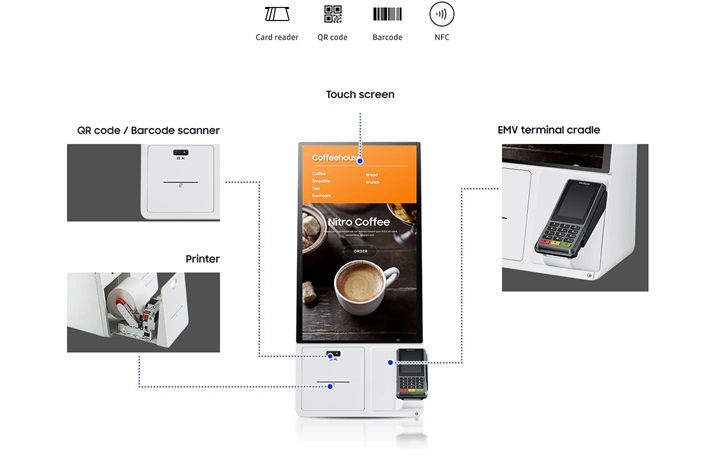 Kiosk Samsung má modulární design, který poskytuje různé možnosti platby včetně kreditní karty, čárového kódu, QR kódu a NFC, spolu s vestavěnou tiskárnou. To znamená, že nepotřebuje žádné další periferie pro pokročilé řešení typu „vše v jednom“, které také umožňuje rychlou a snadnou údržbu.