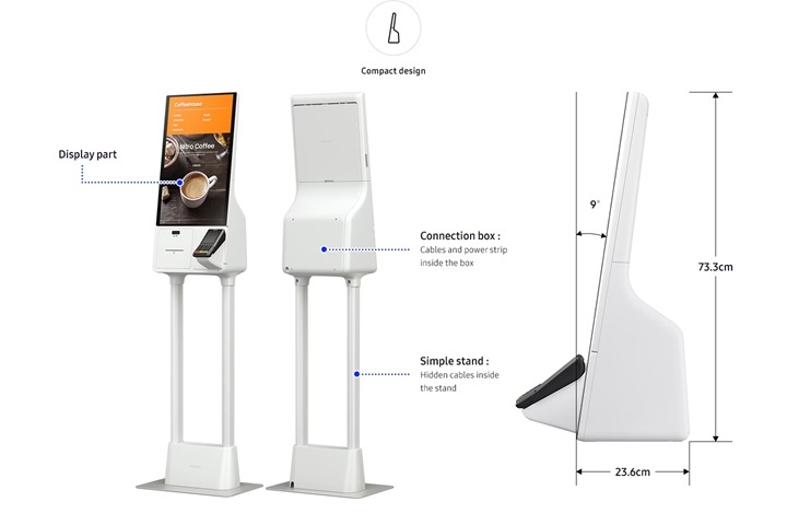 Kiosek Samsung tvoří displejová sekce a připojovací box (Connection Box), spolu s volitelným stojanem. Design umožňuje čisté a praktické vedení kabelů, zatímco díky šedobílé barevnosti a jednoduchému stojanu kiosek stylově zapadne do jakéhokoliv prodejního interiéru.