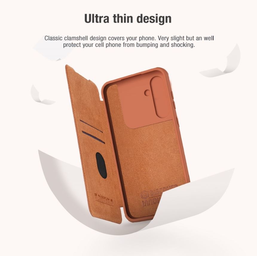 Nillkin QIN Book PRO pouzdro je vyrobeno z kvalitní PU kůže, otevírá se do boku jako knížka a navíc je oproti klasickému QIN Book vybaveno posuvným krytem čoček fotoaparátu.