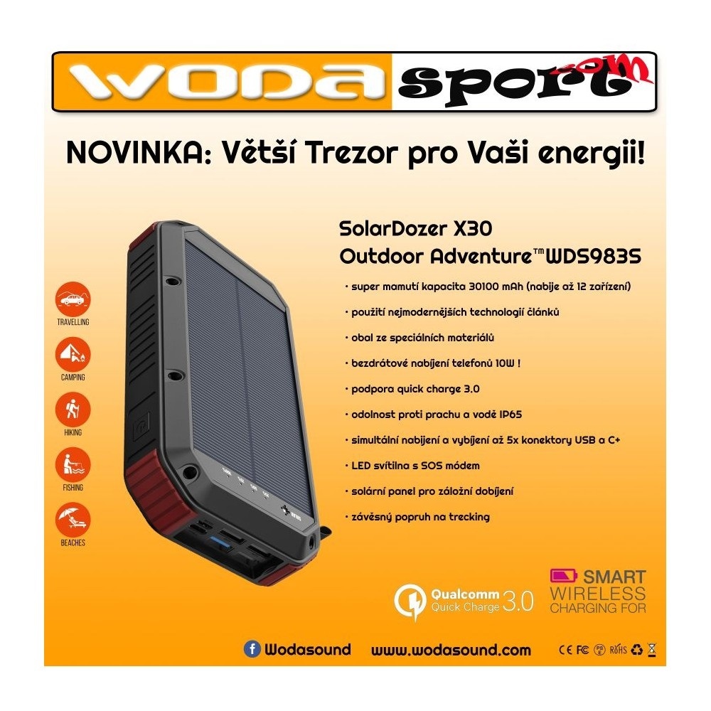 Wodasport laděná edice smart VODOTĚSNÁ a nárazuvzdorná (IP65) outdoor powerbanka 30100mAh při napětí 5V s dvojitým bateriovým inteligentně řízeným okruhem s pomocným dobíjením 3000mA solar silicon panelem, postačí k nabití cca 14 smartpohonů. Může nabíjet až 5 zařízení najednou – 4xUSB + bezdrátové nabíjení / C+ . Nabízí 3A výstup s neuvěřitelně rychlým nabitím.