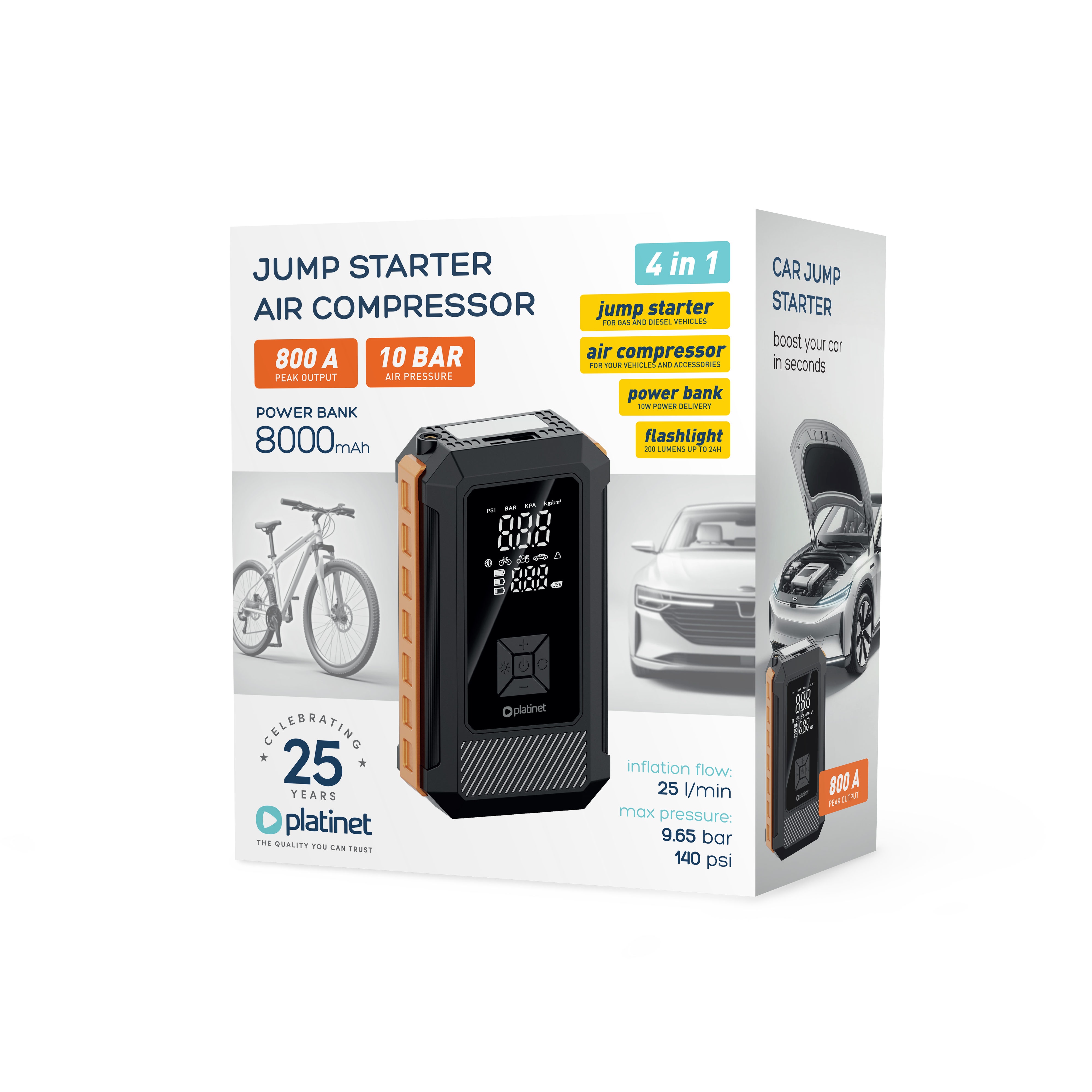 Powerbanka PMPBTP s funkcí JUMP STARTER 8000 mAh / 800 A s vestavěným kompresorem 140 PSI a svítilnou.