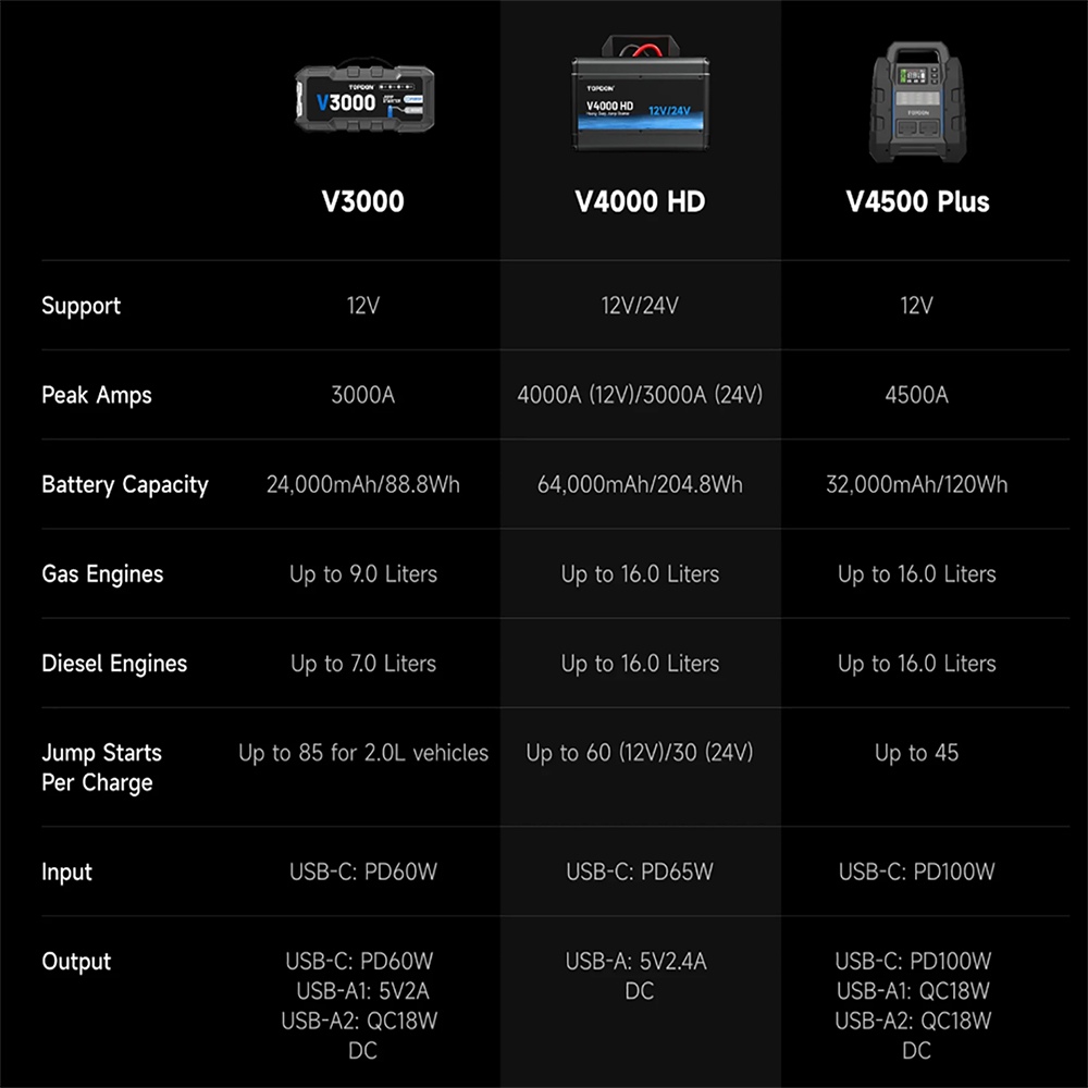 TOPDON V4000 HD je špičkový startovací zdroj navržený pro nestandartní podmínky. Tento profesionální model zvládá 12V i 24V systémy a je určen nejen pro osobní automobily, ale také pro nákladní vozy, autobusy, stavební techniku a těžká pracovní vozidla.