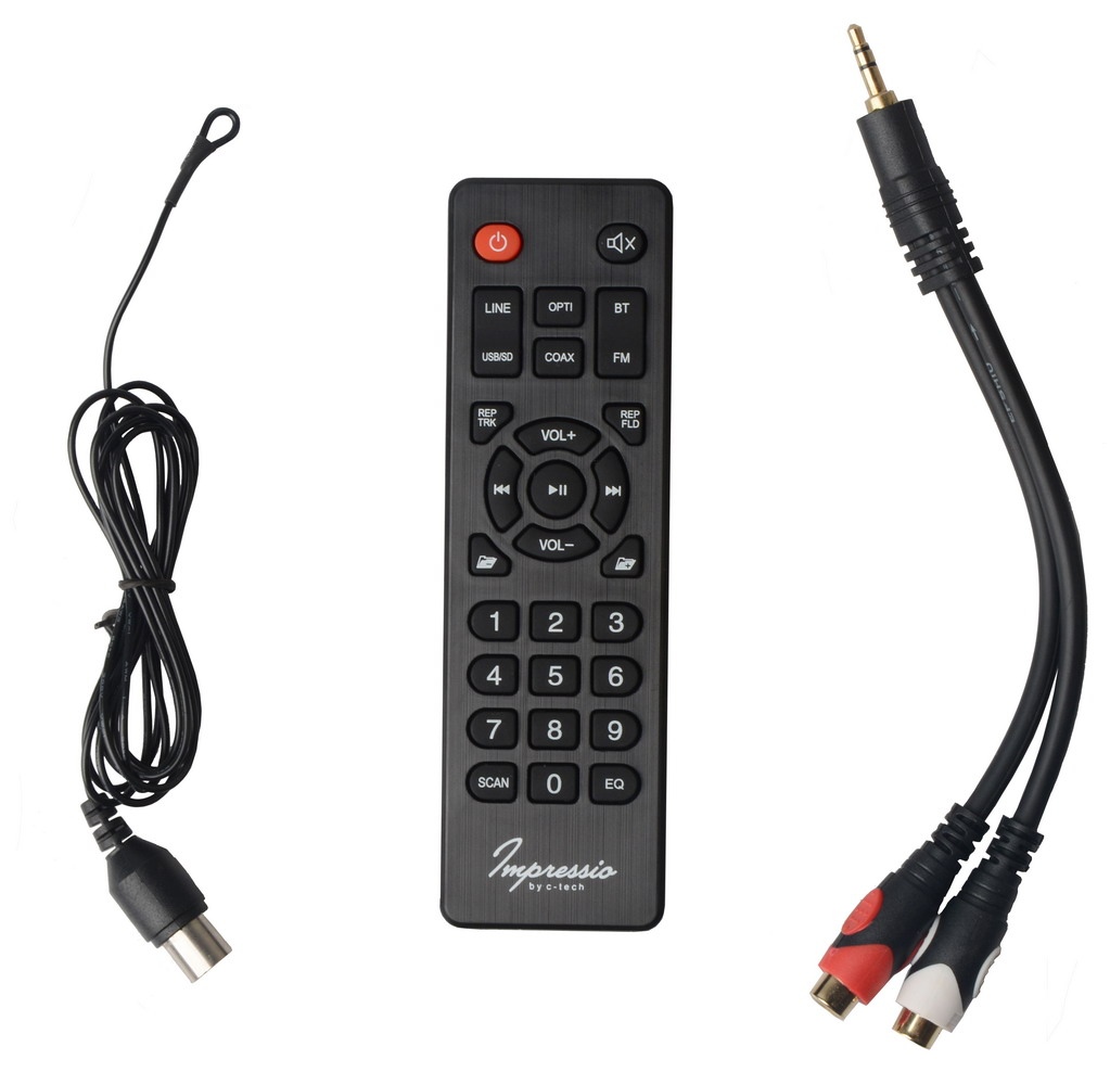 V pohodlí Vašeho obývacího pokoje asi nebudete sedět přímo u reproduktoru, proto budete častěji k jeho ovládání používat dodaný dálkový ovladač. Ten zvládne většinu funkcí, jako je: upravení hlasitosti, volba skladby nebo FM stanice, spuštění a přerušení přehrávání, nebo volbu zdroje zvuku mezi Bluetooth, FM rádiem, pamětí USB, nebo SD kartou a LINE-IN vstupem, optickým a koaxiálním vstupem.