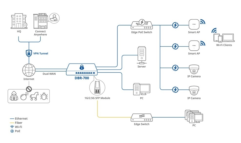 DBR-700 nabízí vysoce výkonné síťové připojení s 2,5GE WAN portem a osmi 2,5GE porty pro rychlé a spolehlivé připojení. Je ideální pro malé kanceláře a kavárny, nabízí flexibilní a dostatečnou šířku pásma pro vaši síť. Díky 2Gb/s firewallu a IPsec VPN tunelům zajišťuje bezpečný vzdálený přístup. Vestavěná správa AP zjednodušuje ovládání bezdrátových přístupových bodů, což z něj činí vynikající volbu pro firmy hledající efektivní a bezpečná síťová řešení.