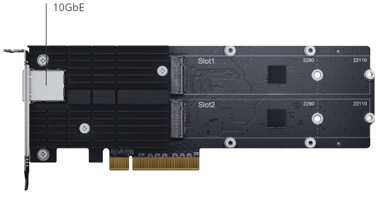 Adaptér Synology E10M20-T1 pomáhá současně zvyšovat výkon vstupu/výstupu i šířky pásma s využitím jediného rozšiřovacího slotu PCIe vašeho zařízení Synology NAS.