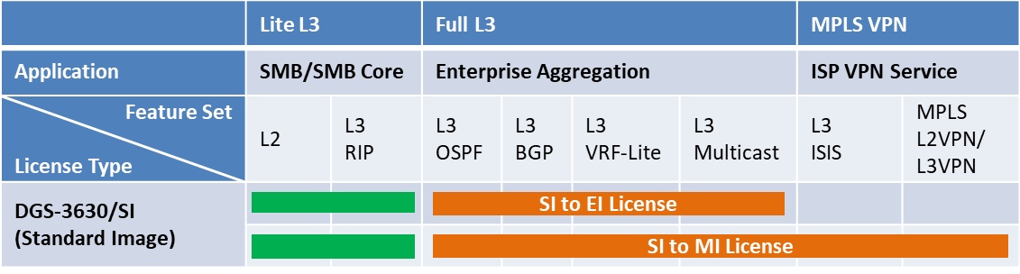 D-Link DGS-3630-28SC-SM-LIC je digitální licence pro 28-portový L3 stohovatelný Gigabit SFP switch D-Link DGS-3630-28SC/SI. Licence slouží pro upgrade ze základní sady funkcí (Standard Image) na sadu funkcí pro Metro Ethernet sítě (Metro Image). Licence přidává funkci Super VLAN a následující L3 a MPLS funkce: