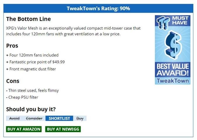 Recenze: XPG Valor Mesh Mid-Tower ATX Case Review (tweaktown.com)Recenze: https://www.eteknix.com/xpg-valor-mesh-case-review/Recenze: https://www.techpowerup.com/review/xpg-valor-mesh/