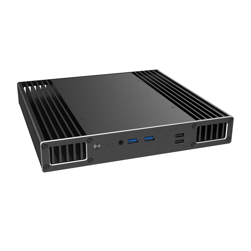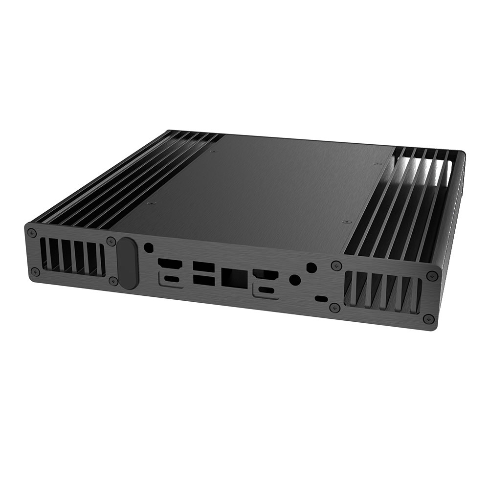 Nízkoprofilová skříň bez ventilátoru pro desku 12. generace Intel NUC (Wall Street Canyon). Podporuje montáž VESA. Pojme 2,5" SATA HDD/SSD.