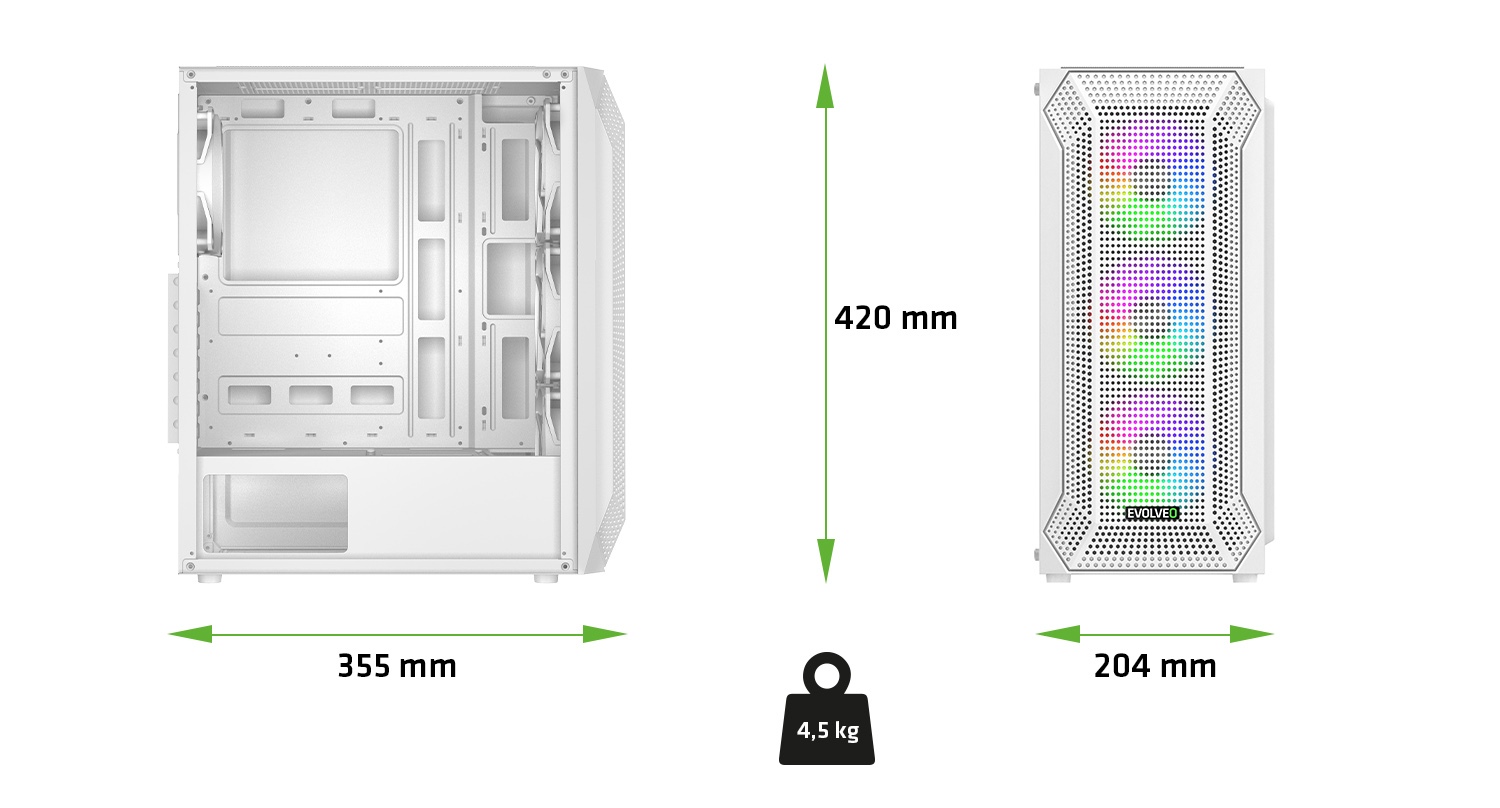 Na první dobrou byste možná řekli, že počítačová skříň o rozměrech 204 × 420 × 355 mm a hmotnosti 4,5 kg nemůže nabízet nic extra. Jenže to by nesměla být řeč o EVOLVEO Xenon-WH-4 – počítačové skříni, u které je přijatelná velikost v dokonalé rovnováze s velkorysostí vnitřního prostoru. Její zásluhou se vám stolní počítač bez problému vejde na stůl i do skromného herního koutku, ovšem do nitra skříně se vejde vše, co si vaše neskromné herní ambice žádají.