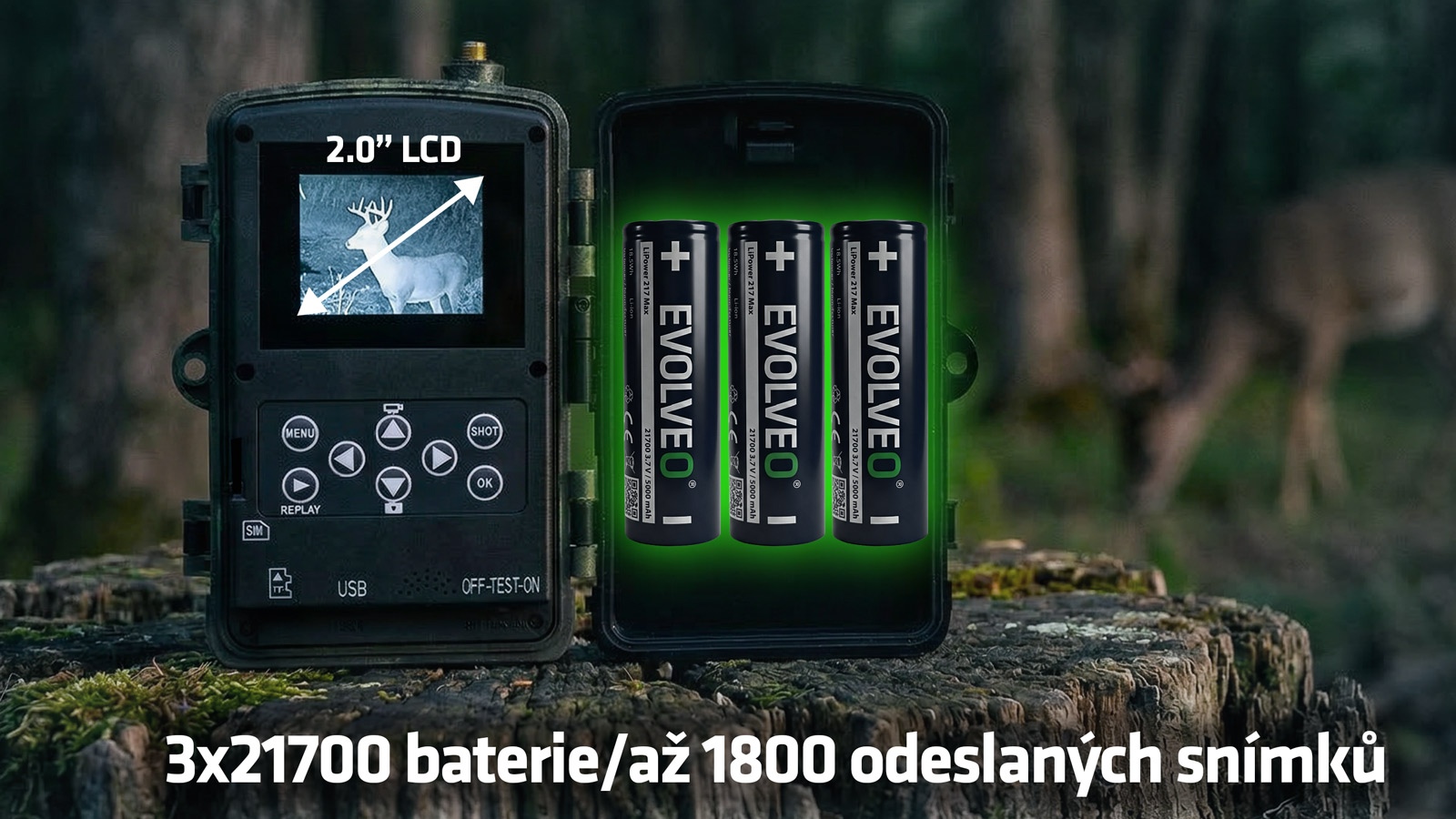 Největší výhodou tohoto modelu je bez kompromisů řešené napájení. Fotopast využívá 3× Li-Ion 21700 akumulátory, které poskytují výrazně vyšší kapacitu než běžné baterie v této kategorii. V praxi to znamená výrazně delší provoz bez nutnosti zásahu, ideální pro dlouhodobé nasazení v terénu. Za optimálních podmínek zvládne zařízení odeslat až 1500 snímků na jedno nabití, což představuje zásadní rozdíl oproti běžným modelům. Navíc máte možnost baterie jednoduše vyměnit nebo dokoupit další, takže si můžete připravit náhradní sadu a během pár sekund pokračovat v provozu. V kombinaci s externím napájením nebo solárním panelem se tak z fotopasti stává prakticky bezúdržbové řešení.