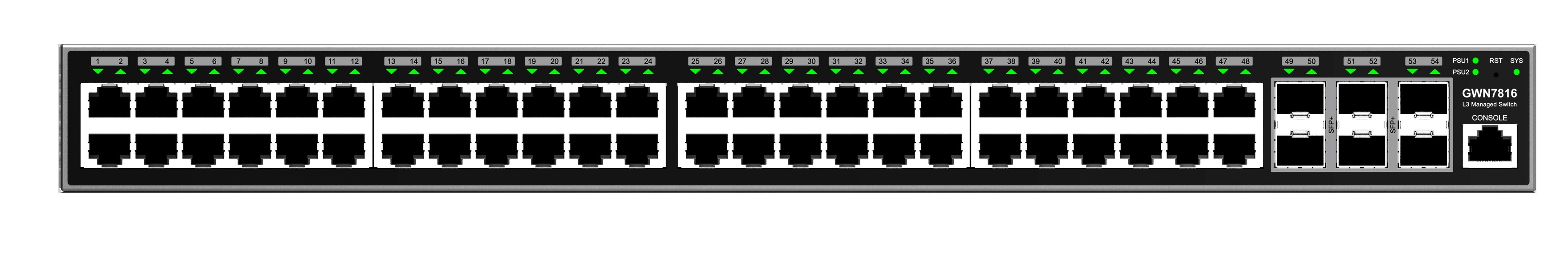 GWN7816 je 48portový síťový switch na 3. vrstvě, který umožňuje středním a velkým podnikům vybudovat škálovatelné, bezpečné, vysoce výkonné a inteligentní podnikové sítě, které lze plně spravovat. Podporuje pokročilou VLAN pro flexibilní a sofistikovanou segmentaci provozu, pokročilou QoS stanovení priorit síťového provozu, IGMP/MLD Snooping pro optimalizaci výkonu sítě a komplexní můžnosti zabezpečení proti potenciálním útokům.