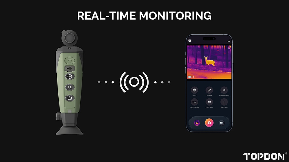 Model TS004 umožňuje bezdrátové připojení k telefonu prostřednictvím aplikace Toplnfrared pro pozorování v reálném čase. Díky ní můžete pořizovat snímky a nahrávat videa se zvukem i bez připojení k internetu.
