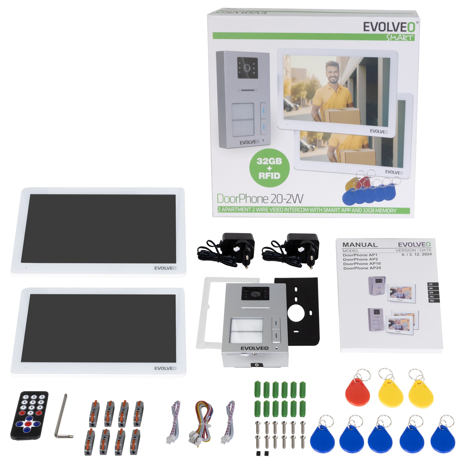 Videozvonek EVOLVEO DoorPhone 20-2W je připraven na moderní dobu plnou chytrých technologií a internetu věcí. Každý z monitorů se dá připojit k Wi-Fi a ovládat přes mobilní aplikaci Smart Life nebo Tuya. Díky tomu můžete dostávat notifikace o návštěvách přímo na svůj smartphone, komunikovat s návštěvníky na dálku, nebo dokonce odkudkoliv na světě ovládat dveřní zámek. Systém podporuje i více uživatelů, takže každý člen rodiny může mít přístup ke všem funkcím. A pokud chcete mít přehled o všem, co se za dveřmi šustlo, určitě vás potěší i možnost ukládání záznamů z kamery do 32GB interní paměti nebo na paměťovou kartu (o kapacitě až 128 GB).
