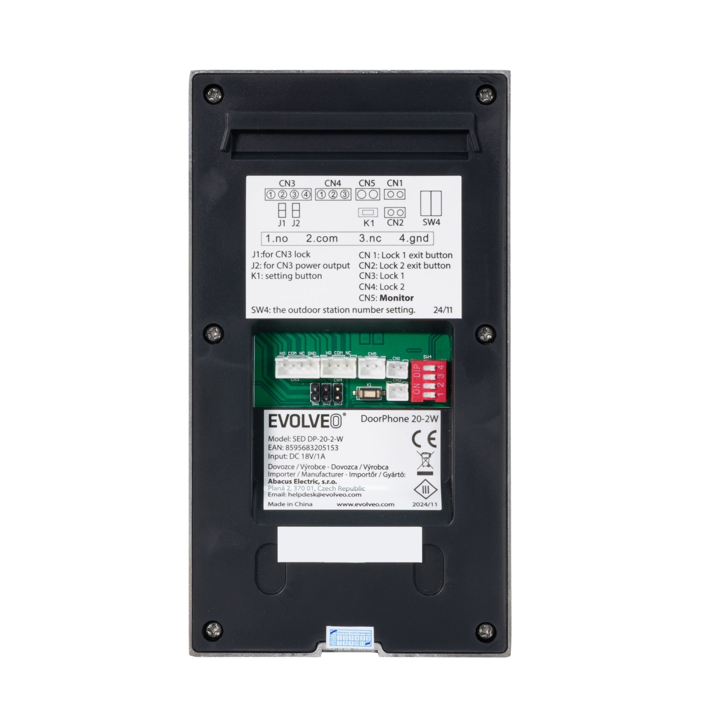 Zapojení videozvonku EVOLVEO DoorPhone 20-2W zvládnete díky dvoudrátovému provedení (2 vodiče bez polarity) levou zadní. V balení přitom najdete vše potřebné – včetně montážních rámečků, šroubů a hmoždinek. Nemusíte tak řešit složité technické detaily ani nic dodatečně dokupovat. Stačí pár jednoduchých kroků a váš nový strážce dveří je připraven k akci.