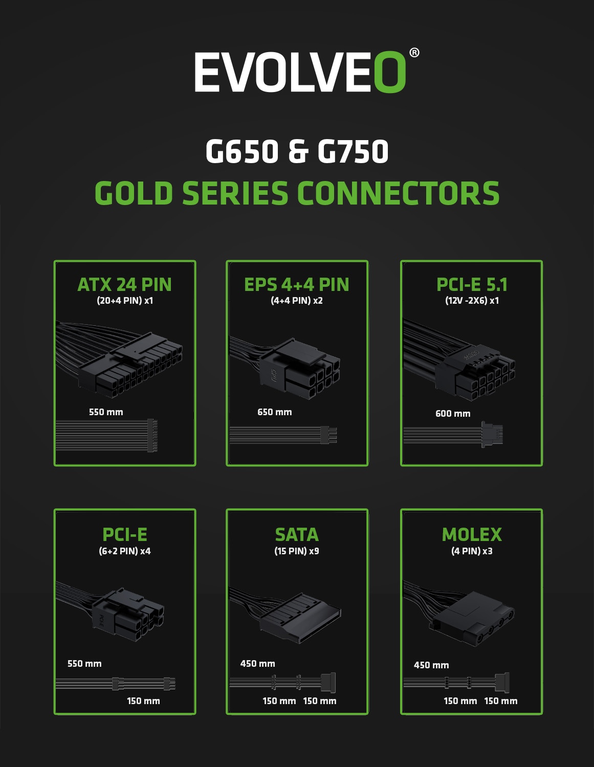 Zapomeňte na zamotané kabely, které brání proudění vzduchu a ještě vaší počítačové skříni kazí styl. Zdroj EVOLVEO G850-BK je plně modulární, takže k němu připojíte jen ty kabely, které opravdu potřebujete. Součástí balení jsou všechny důležité šňůry – jeden kabel ATX 24 PIN, dva EPS 4+4 PIN, dva PCI-E 6+2 PIN, jeden PCI-E 5.1 12V-2×6, tři SATA a jeden MOLEX. Díky tomu máte místo na vše od CPU a GPU přes disky až po vymazlené LED pásky či jiné extra prvky.Vstupní napětí zdroje činí 100–240 V. Součástí zařízení je přitom i 230V vstup na síťový kabel (tento kabel je součástí dodávky).